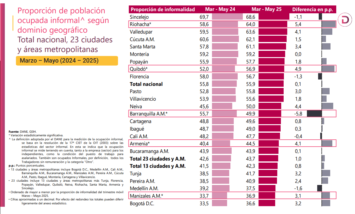 3. Sin embargo, la #TasaDeInformalidad presentó un incremento significativo (+1,8 p.p.) al pasar de 53,9% en el periodo Marzo-Mayo de 2024 a 55,6% en el periodo Marzo-Mayo de 2025. Por lo tanto, #Villavicencio presenta una tasa de informalidad laboral muy por encima (+13,3 p.p.) del promedio de las 13 principales ciudades del país.