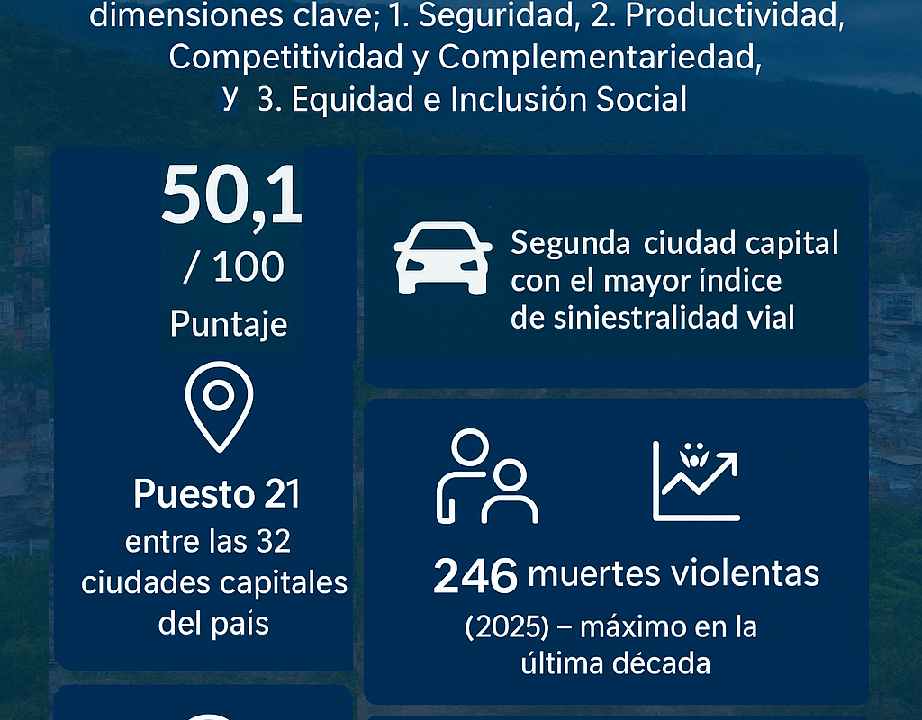 Al analizar los resultados del ICM 2025 frente al ICM 2024, se evidencia el mayor retroceso en el indicador Seguridad y es que Villavicencio, de acuerdo a las estadísticas reportadas por el Instituto Colombiano de Medicina Legal con corte a agosto de 2025, registra un acumulado de 246 muertas violentas en lo corrido del año, siendo esta la cifra más alta de la última década. Asimismo, de acuerdo al Observatorio Nacional de Seguridad Vial, Villavicencio se ubica como la segunda ciudad capital con el mayor índice de siniestralidad vial, después de Cartagena. En lo corrido del año se reportan 92 muertes en accidentes de tránsito en Villavicencio, la cifra más alta desde el año 2016.